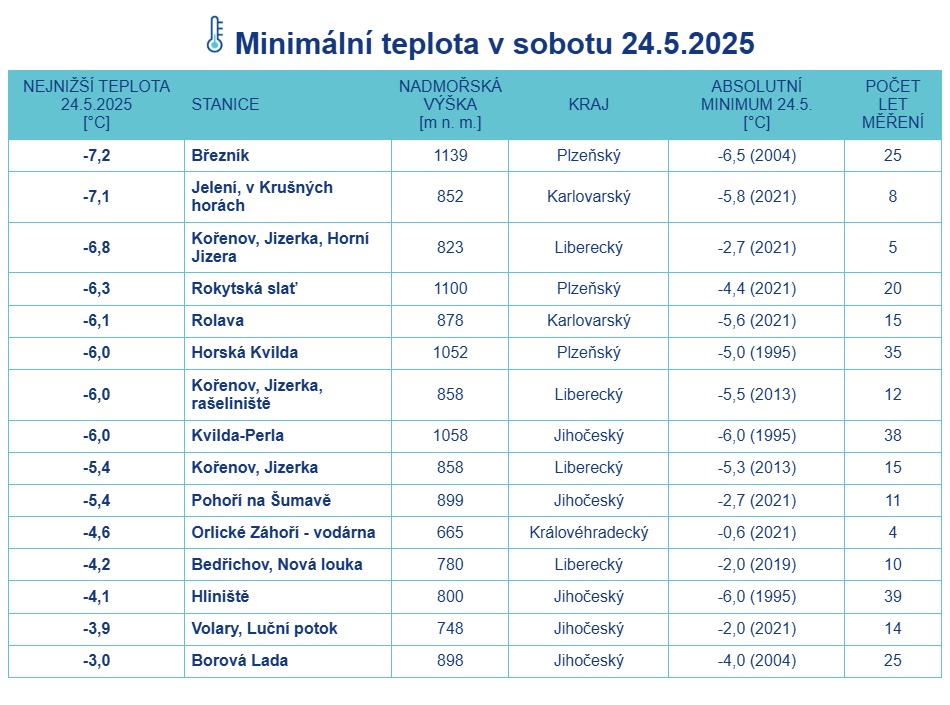 Během noci klesly teploty ve 2 metrech nad zemí nejčastěji na +4 až -1 °C. Nejnižší teplotu naměřila stanice Březník na Šumavě -7,2 °C, ze stanic do 600 m n. m. Šindelová, Obora -2,5 °C. Hned 52 stanic ze 167, které měří alespoň 30 let, zaznamenalo rekordní minimum pro 24. 5. Mezi nimi i tři stanice měřící více než 100 let: