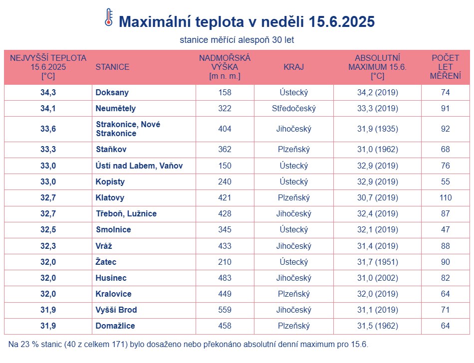 »Na 23 % meteorologických stanic, které měří 30 let a více (40 ze 171) bylo dosaženo nebo překonáno absolutní denní maximum pro 15. června,« konstatovali meteorologové.