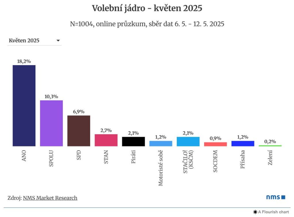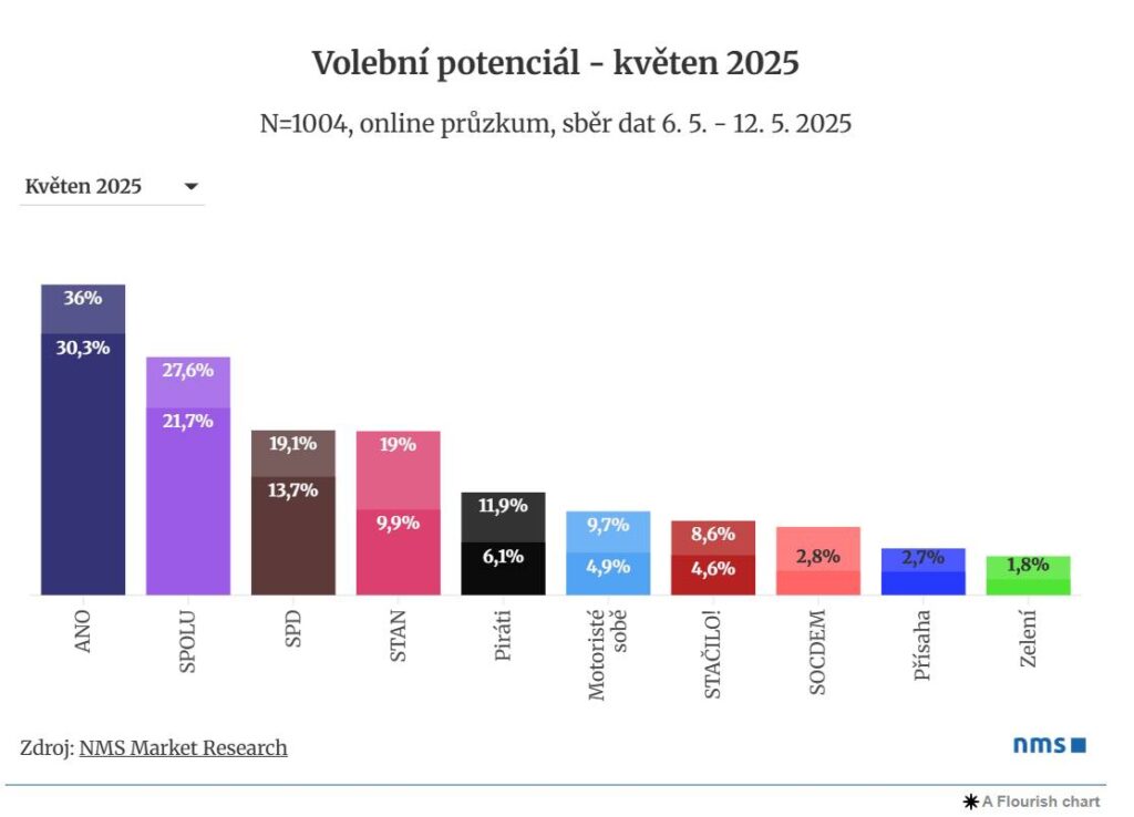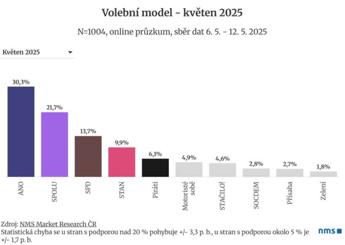 Hnutí ANO stále drží výrazný náskok před SPOLU, ovšem nejvíce raketový je vzestup popularity hnutí SPD, které kandiduje do Poslanecké sněmovny s podporou stran Trikolora, Svobodní a PRO. Podle květnového modelu agentury NMS Market Research by národně-konzervativní kandidátka získala téměř 14 % hlasů.