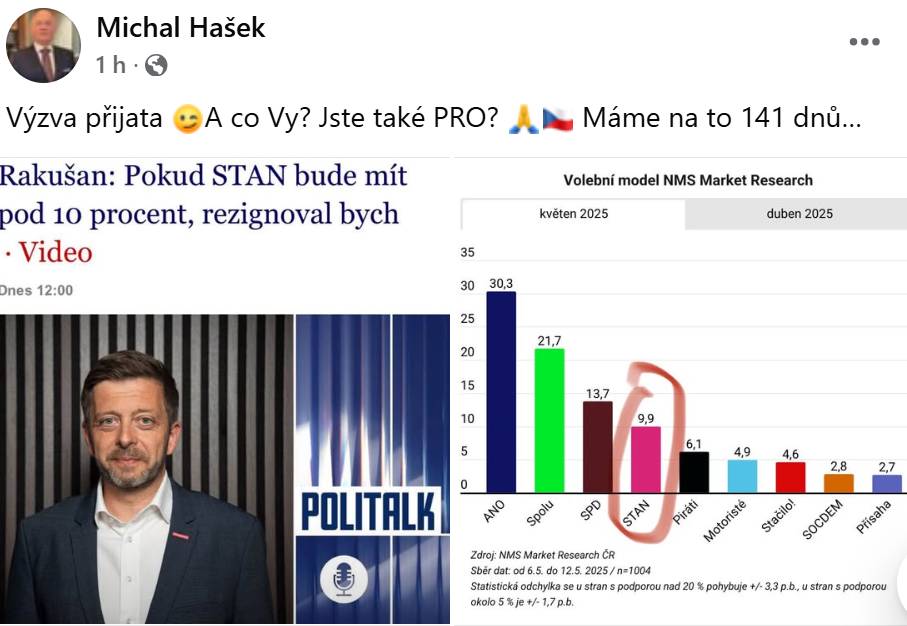 Šéf jihomoravské PRO Michal Hašek to okomentoval na svém Facebooku s citací předsedy Víta Rakušana, který se nechal slyšet, že kdyby měli Starostové pod 10 procent, rezignoval by. »Výzva přijata. Máme na to 141 dnů,« napsal emeritní hejtman Jihomoravského kraje.