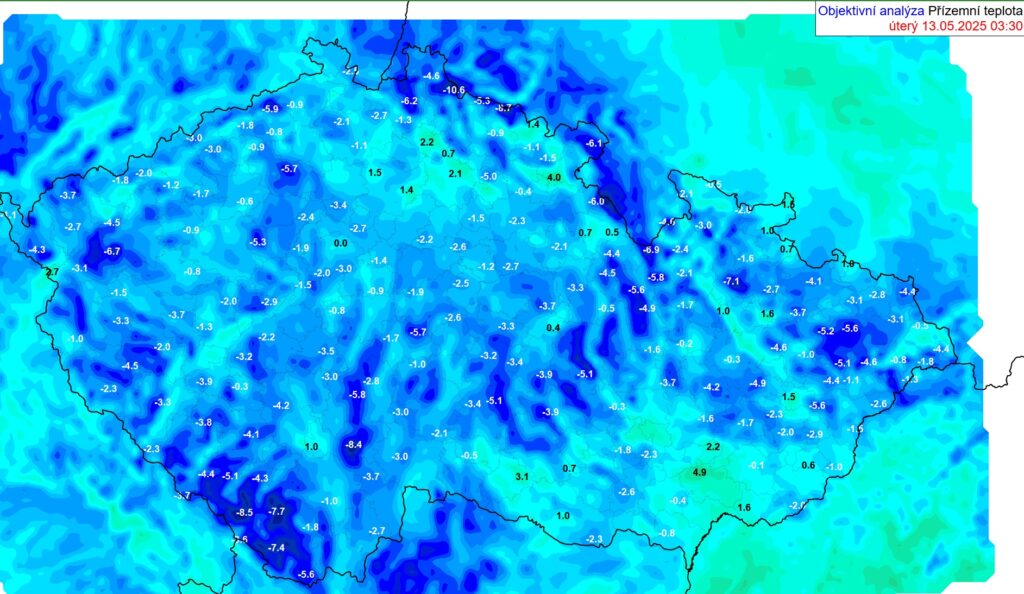 Na velké části území se přízemní teploty pohybovaly spíše pod nulou a byla i místa, kde bylo pod -8 °C. – např. Soběslav. »Zítra by přízemní teploty neměly být až tak nízké, místy kolem -2 °C,« ujistil na svém Facebooku Český hydrometeorologický ústav (ČHMÚ).