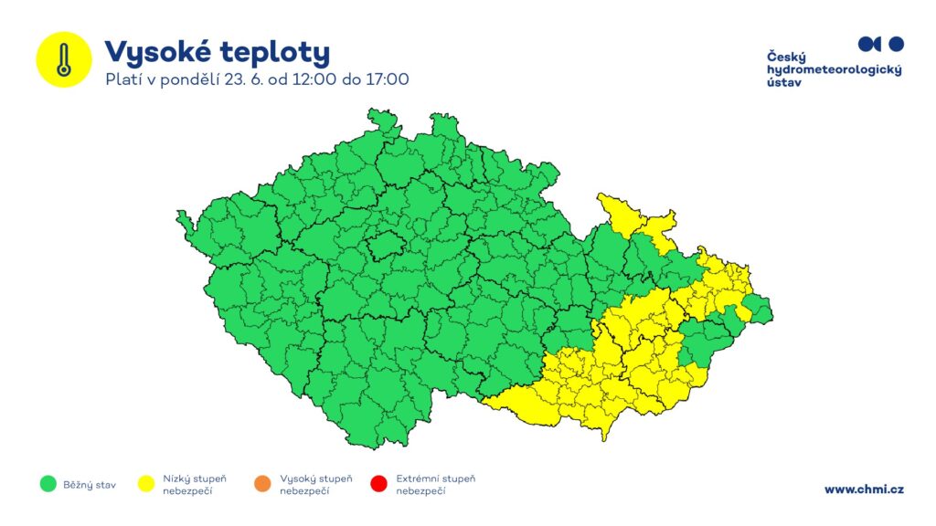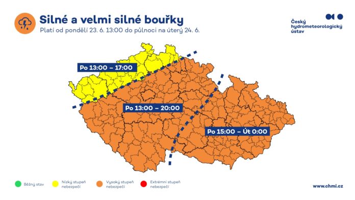 Výstrahu před velmi silnými bouřkami vydal Český hydrometeorologický ústav (ČHMÚ), který zároveň varoval před vysokými teplotami.