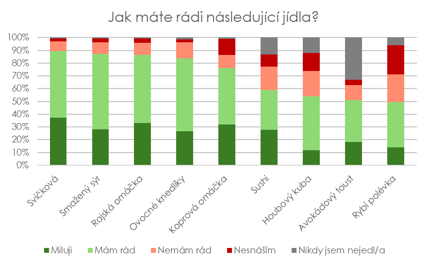 Pokud láska skutečně prochází žaludkem, výsledky průzkumu Barometr FOOD odhalily, jak se nejrychleji dostat k srdci českého strávníka. Jeho nejoblíbenějším jídlem je totiž svíčková. Průzkum ukázal, že pozitivní vztah k tomuto pokrmu má hned 89,4 % populace. Celkem 37,4 % strávníků uvedlo, že jej přímo miluje. Druhé místo si vysloužil smažený sýr, ten má v oblibě jen o dvě procenta národa méně. Naopak nejméně českých srdcí tíhne k rybím polévkám, k nimž v průzkumu upřímnou nenávist vyjádřilo celkem 22,8 % Čechů.