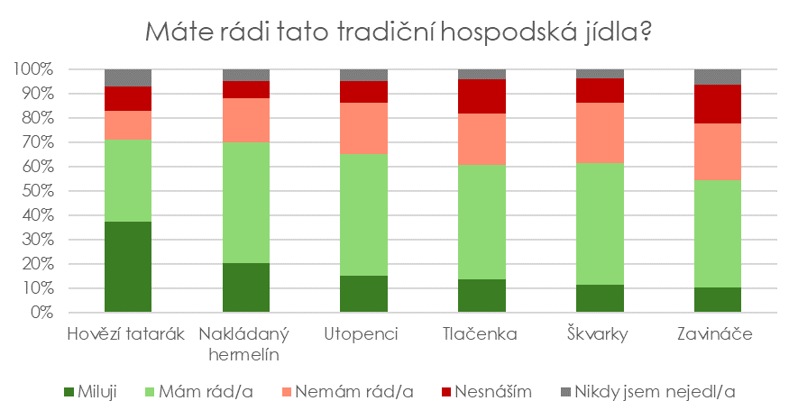 V případě tradičních jídel, která se na českých talířích shledávají s největším úspěchem, rozhodně nelze opomenout ani klasické »hospodské chuťovky«. Zde se bezkonkurečně na prvních příčkách průzkumu umístil hovězí tatarák. Kladně se k tomuto pokrmu staví 71,1 % Čechů. Až 37,3 % z nich dokonce uvedlo, že tuto kontroverzní lahůdku miluje. Paradoxně ale i největší procento respondentů odpovědělo, že ho zatím nikdy nevyzkoušelo.