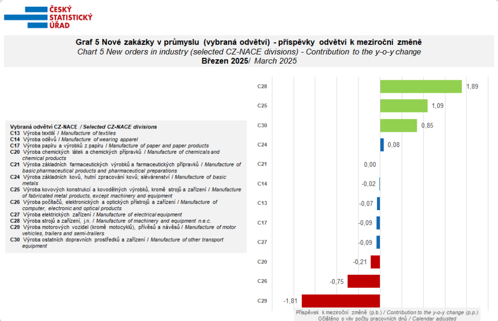 Meziroční pokles produkce pak statistici zaznamenali například ve výrobě motorových vozidel, přívěsů a návěsů, výrobě počítačů, elektronických a optických přístrojů a zařízení nebo ve farmaceutickém průmyslu.