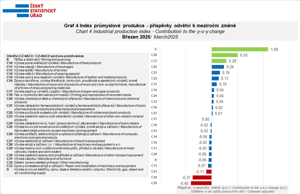 »K březnovému růstu průmyslové produkce přispěla především výroba elektřiny, kde se projevila nižší loňská srovnávací základna. Produkce ve zpracovatelském průmyslu stagnovala, mírné oživení můžeme pozorovat například u výroby stavebních hmot a materiálů,« komentoval výsledky Radek Matějka, ředitel odboru statistiky zemědělství a lesnictví, průmyslu, stavebnictví a energetiky ČSÚ.
