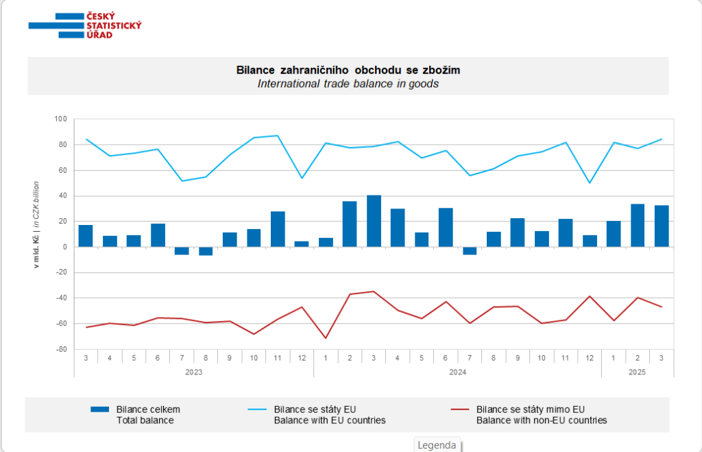 Bilance zahraničního obchodu se zbožím v běžných cenách skončila v březnu s přebytkem 32,5 mld. Kč, který byl oproti stejnému období minulého roku o osm miliard menší.
