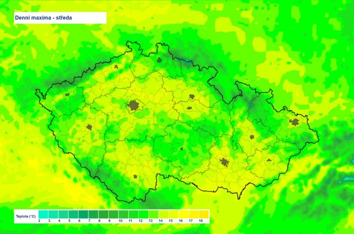 »Zbytek týdne se ponese i nadále ve znamení chladného počasí s minimem srážek. V sobotu by ale hlavně v severovýchodní polovině území mohlo slabě občasně pršet a s největší pravděpodobností v oblasti Jeseníků, Orlických hor či Beskyd by nad cca 1000 m mohlo i slabě sněžit,« uvedli meteorologové.