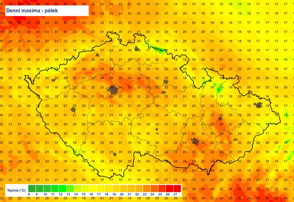 Nejchladněji bude v sobotu, kdy nejvyšší odpolední teploty vystoupají jen lehce nad 20 stupňů Celsia, na severovýchodě bude dokonce jenom kolem 16 stupňů. V neděli se začne postupně oteplovat a naměříme až 25 stupňů, přičemž dojde i k ubývání srážek a oblačnosti. Ačkoli jde o předzvěst příjemného počasí, které přijde do České republiky na počátku příštího pracovního týdne, tropické teploty z počátku prázdnin se v nejbližší době nevrátí.