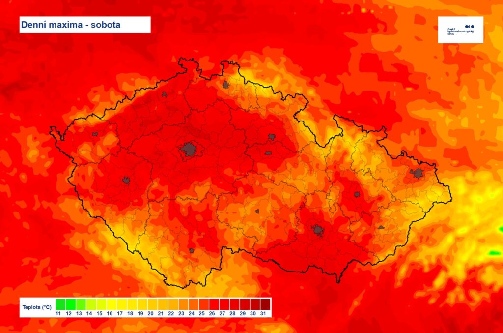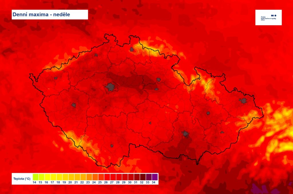 Nedělní ranní teploty klesnou na 18 až 14 °C, odpoledne v nejteplejších oblastech překročí tropickou třicítku, čekáme 27 až 32 °C.