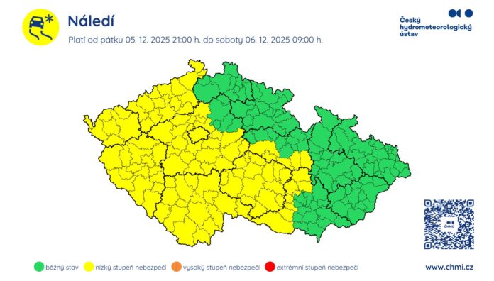 Už páteční odpoledne a večer přinesou do většiny regionů déšť a mrholení, zejména na západě a severu republiky. Teploty se budou pohybovat kolem pěti stupňů, na Moravě o něco níže. V noci pak může na mnoha místech mrznout, což je nejkritičtější kombinace pro vznik náledí — Český hydrometeorologický ústav proto vydal výstrahu platnou až do sobotního dopoledne.