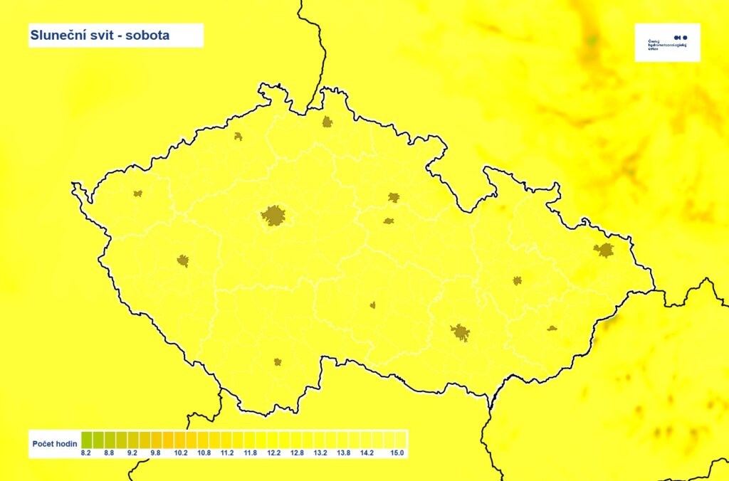Téměř bezoblačné počasí vydrží až do nedělního večera, kdy v Čechách na studené frontě začne od západu přibývat oblačnosti, místy s přeháňkami a bouřkami. »V sobotu bude jasno a příjemně teplo, v neděli nás čekají vysoké teploty a večer dorazí od západu na část území bouřky,« napsali meteorologové.