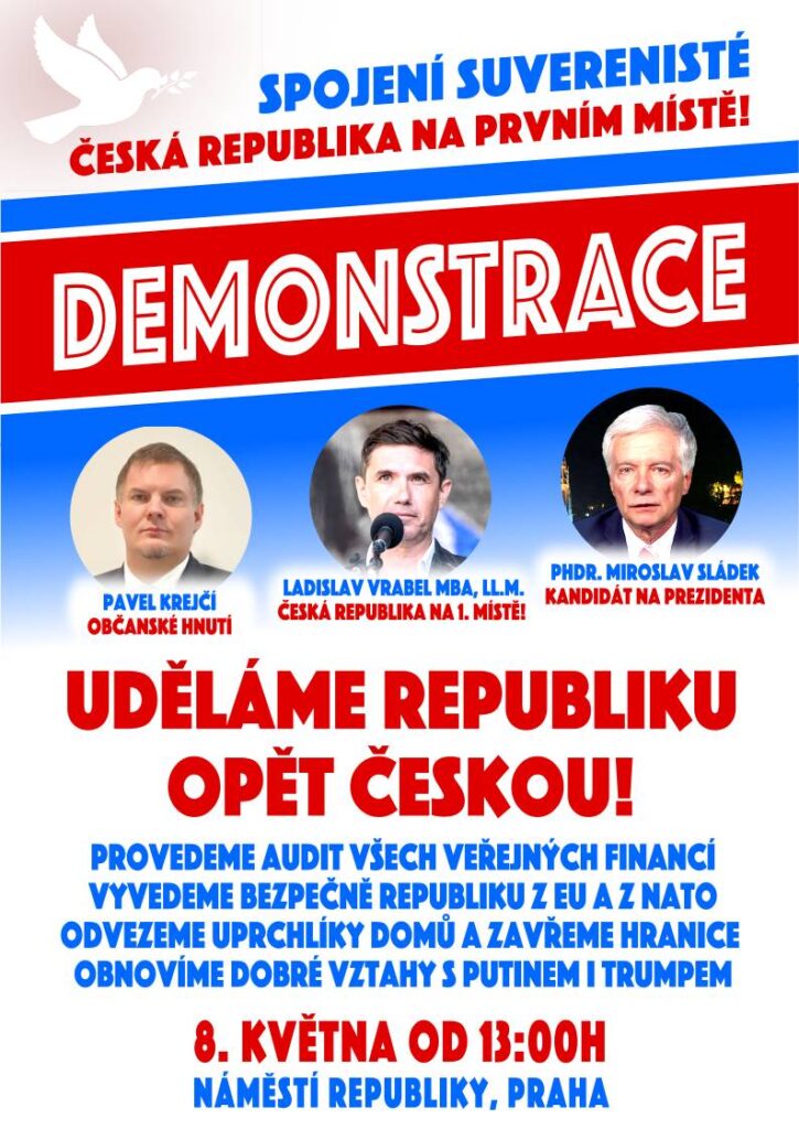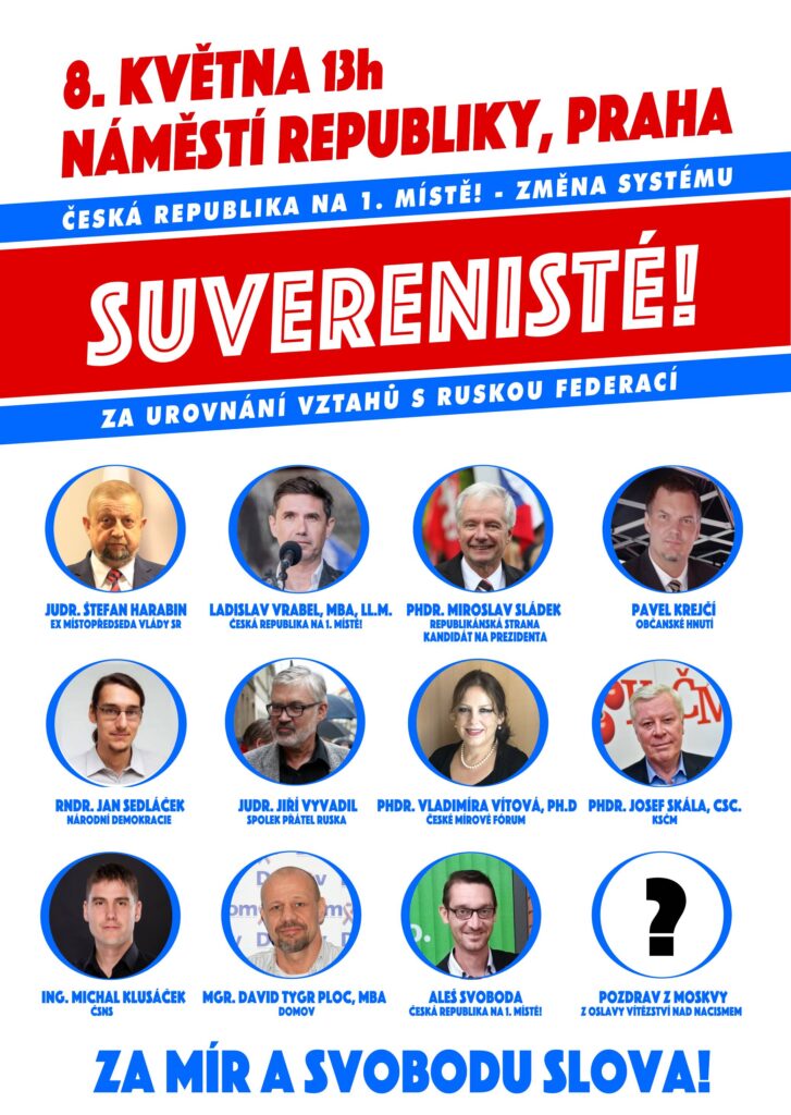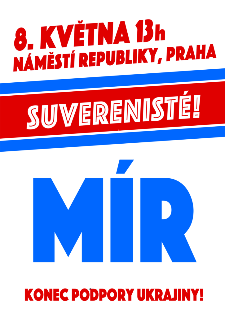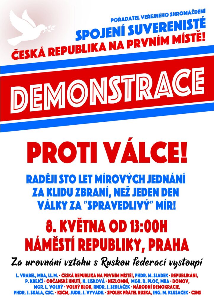 Na náměstí Republiky se 8. května od 13 hodin bude demonstrovat za urovnání vztahů s Ruskou federací. »Raději sto let mírových jednání než jeden den války za ‚spravedlivý‘ mír,« uvádějí pořadatelé. Kromě Vrabela, který se proslavil pořádáním statisícových demonstrací proti vládě Petra Fialy na podzim roku 2022, promluví i exposlanec a kandidát na prezidenta Miroslav Sládek, bývalý místopředseda slovenské vlády a rovněž kandidát na hlavu státu, ovšem u našich východních sousedů, Štefan Harabin či předsedkyně Československého mírového fóra Vladimíra Vítová.