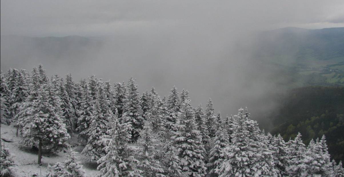 Přes noc na hřebenech Jeseníků dle měření sněhoměrných polštářů přibylo i kolem 10 cm nového sněhu. Teploty spadly, stejně jako na hřebenech Beskyd či Krkonoš, kde sníh leží také, dokonce pod nulu.