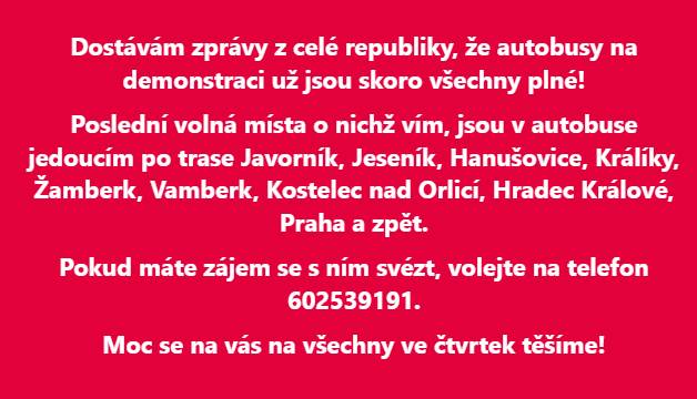 Dá se předpokládat, že Staroměstské náměstí bude zaplněné podobně, jako když tam před rokem slavili čeští hokejisté titul mistrů světa. »Dostávám zprávy z celé republiky, že autobusy na demonstraci už jsou skoro všechny plné!« napsal včera šéf PRO Jindřich Rajchl na svém Facebooku a připojil seznam posledních volných míst.