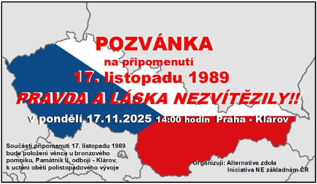 Další vlastenecké shromáždění uvidí Klárov od 14 hodin. Pořádá ho iniciativa NE základnám ve spolupráci s Alternativou zdola. Součástí připomenutí 17. listopadu 1989 bude položení věnce u bronzového památníku druhého odboje. Kromě představitelů obou iniciativ promluví například reprezentanti KSČM, ČSSD či strany DOMOV.