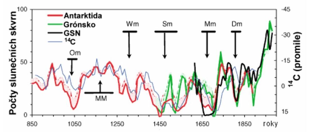 »Rekonstrukce počtů slunečních skvrn z koncentrací 10Be (beryllia – JZ) z ledovců v Antarktidě (červená) a Grónsku (zelená). Odpovídající profily jsou omezeny vlastními výsledky rekonstrukce (horní obálka k vystínované oblasti) a upravenými rekonstruovanými hodnotami (podrobnosti v [1, 2]). Tlustá černá čára ukazuje skutečně naměřené GSN od roku 1610 a tenká modrá čára přeškálovanou koncentraci 14C v letokruzích stromů, opravených o kolísání geomagnetického pole. Svislé šipky znázorňují polohy velkých minim a maxim: Daltonova minima (Dm), Maunderova minima (Mm), Spörerova minima (Sm), Wolfova minima (Wm), Oortova minima (Om) a Středověkého maxima (MM). Časový posun 14C je způsoben jeho dlouhým časem útlumu. (Graf převzat z [1].)«