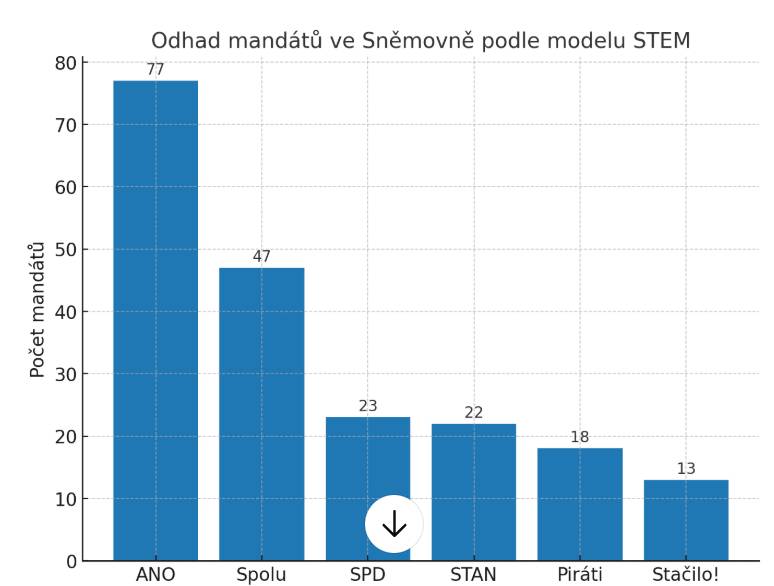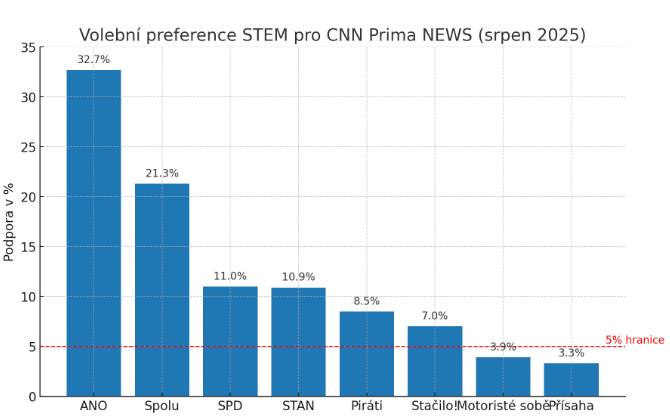Podle nejnovějšího volebního modelu agentury STEM pro CNN Prima NEWS by se vítězem říjnových sněmovních voleb stalo hnutí ANO, které aktuálně oslovuje téměř 33 procent voličů. Druhé místo by obsadila koalice SPOLU (ODS, KDU-ČSL a TOP 09) s více než 21 procenty hlasů. Na třetí příčce se drží SPD, jen těsně následovaná Starosty. Do Poslanecké sněmovny by se podle průzkumu dostali ještě Piráti a hnutí STAČILO!. Naopak Motoristé sobě zůstávají pod pětiprocentní hranicí, navíc se na ně začíná dotahovat Přísaha.