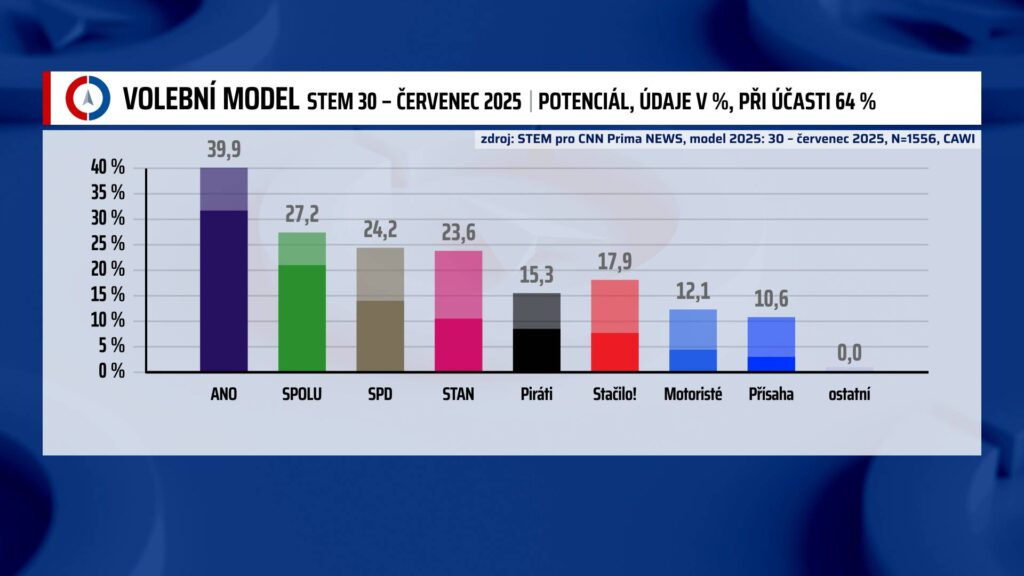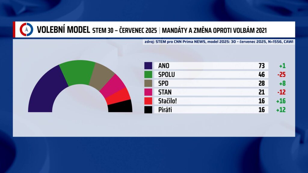 Volby do Poslanecké sněmovny by v červenci vyhrálo hnutí ANO s 31,5 % hlasů. Na druhém místě by se umístila vládní koalice SPOLU, kterou by podpořilo necelých 21 % voličů. Vyplývá to z aktuálního modelu agentury STEM pro CNN Prima NEWS. Třetí pozici si upevňuje SPD, která se díky spolupráci s menšími subjekty profiluje jako nejsilnější sběratel protestních hlasů. Do Sněmovny by se dále dostali Starostové, Piráti a hnutí STAČILO!.
