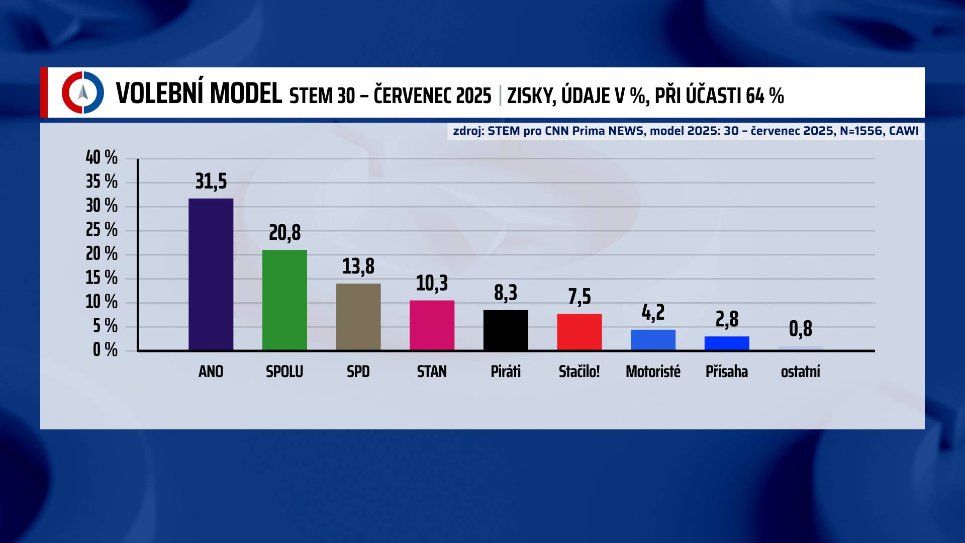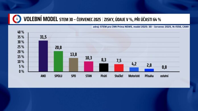 Volby do Poslanecké sněmovny by v červenci vyhrálo hnutí ANO s 31,5 % hlasů. Na druhém místě by se umístila vládní koalice SPOLU, kterou by podpořilo necelých 21 % voličů. Vyplývá to z aktuálního modelu agentury STEM pro CNN Prima NEWS. Třetí pozici si upevňuje SPD, která se díky spolupráci s menšími subjekty profiluje jako nejsilnější sběratel protestních hlasů. Do Sněmovny by se dále dostali Starostové, Piráti a hnutí STAČILO!.
