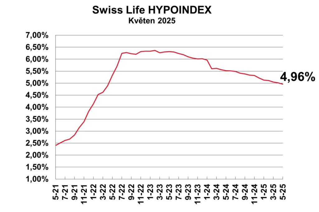 Swiss Life Hypoindex je reprezentován číslem, které odráží aktuální průměrnou nabídkovou sazbu hypotečního úvěru pro odhadní ceny nemovitosti (LTV) do 80 %. V květnu podle něj tato sazba klesla z dubnových 5,01 procenta jen velmi mírně na 5,96 %.