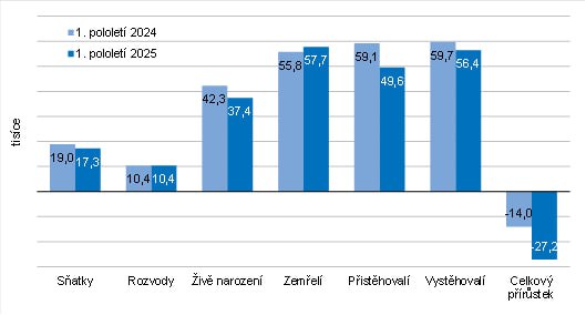 Počet obyvatel České republiky se během prvního pololetí letošního roku podle dnes zveřejněných údajů Českého statistického úřadu snížil o 27,2 tisíce na 10 882 341. Pokles podle statistiků způsobila jak převaha zemřelých nad narozenými (o 20,3 tisíce), tak záporná bilance zahraničního stěhování (−6,9 tis.).