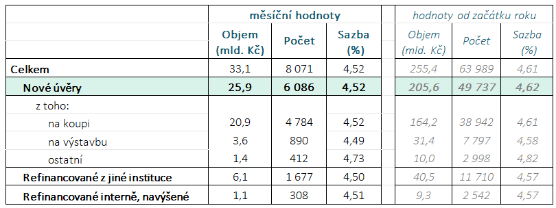 Objemy a počty poskytnutých hypoték a průměrné sazby za srpen 2025 a za dosavadní průběh letošního roku