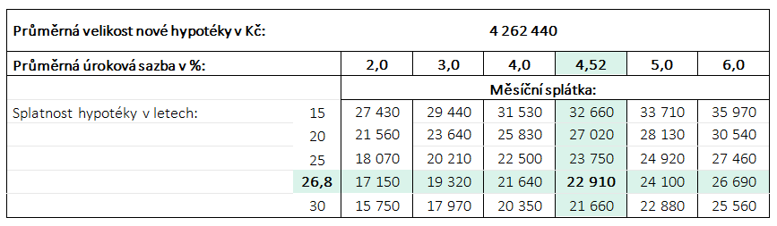 Tabulka udává scénáře vývoje měsíční splátky pro různé délky splatnosti hypotéky. Je z ní patrné, že pokles hypotečních sazeb bezmála o 0,6 procentního bodu vůči jejich loňské průměrné výši 5,07 % přinesl pro průměrnou velikost hypotéky při jejím obvyklém přibližně 26,8letém splácení snížení měsíční splátky o necelých 1400 Kč na přibližně 22,9 tis. Kč, tedy o 1,5 % čistého příjmu žadatele v porovnání s průměrnou splátkou v minulém roce. Ve srovnání s průměrnou hypoteční sazbou 5,81 % v roce 2023 dosáhla úspora kvůli úrokové sazbě necelých 3300 Kč pro hypotéku v její aktuální průměrné hodnotě.