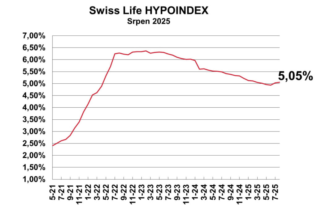 Průměrná hypoteční sazba podle Swiss Life Hypoindexu opět stoupla, a to z červencových 5,03 procenta na srpnových 5,05 %. Jde tak již o druhý nárůst v řadě po květnovém minimu. Informuje o tom Milan Vodička na webu hypoindex.cz.