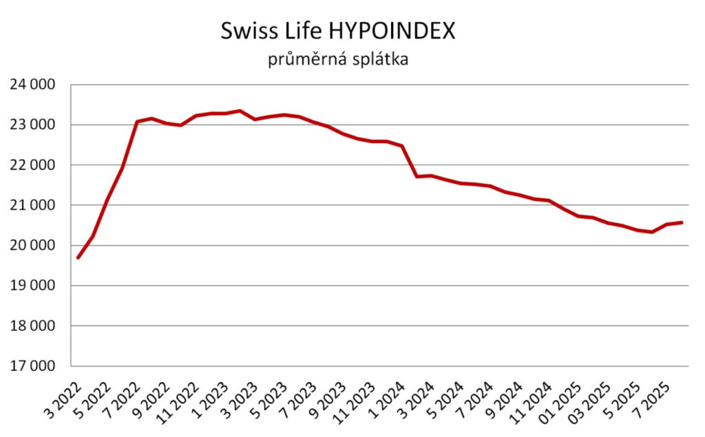 Měsíční splátka hypotečního úvěru na 3,5 milionu korun sjednaného do 80 % LTV při splatnosti 25 let a průměrné nabídkové sazbě 5,05 % nyní činí 20 571 Kč (v 20 518 Kč).