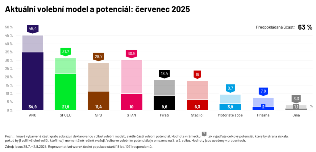 Hnutí ANO si i na přelomu července a srpna udrželo výrazný náskok ve volebních preferencích. Podle aktuálního modelu agentury Ipsos by volby vyhrálo se ziskem 34,9 procenta hlasů. Druhá by skončila vládní koalice SPOLU (ODS, TOP 09 a KDU-ČSL) s podporou 21,9 procenta voličů.
