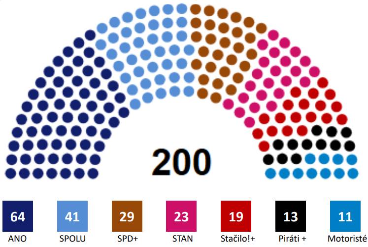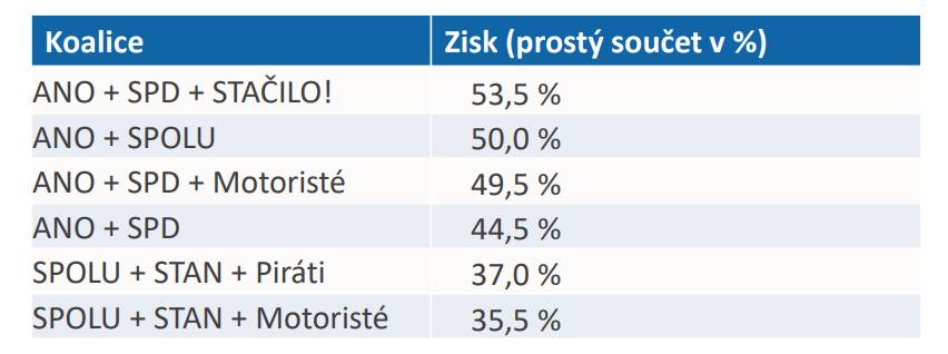 Pokud by se podle srpnového modelu sestavovala Sněmovna, ANO by získalo 64 mandátů, SPOLU 41, SPD 29, STAN 23, STAČILO! 19, Piráti se Zelenými 13 a Motoristé 11. Jedinou koalicí, který by měla podporu nadpoloviční většiny voličů je koalice ANO s SPD a STAČILO!. Podporu poloviny voličů by měla i koalice ANO a SPOLU, která se však jeví jako vysoce nepravděpodobná.