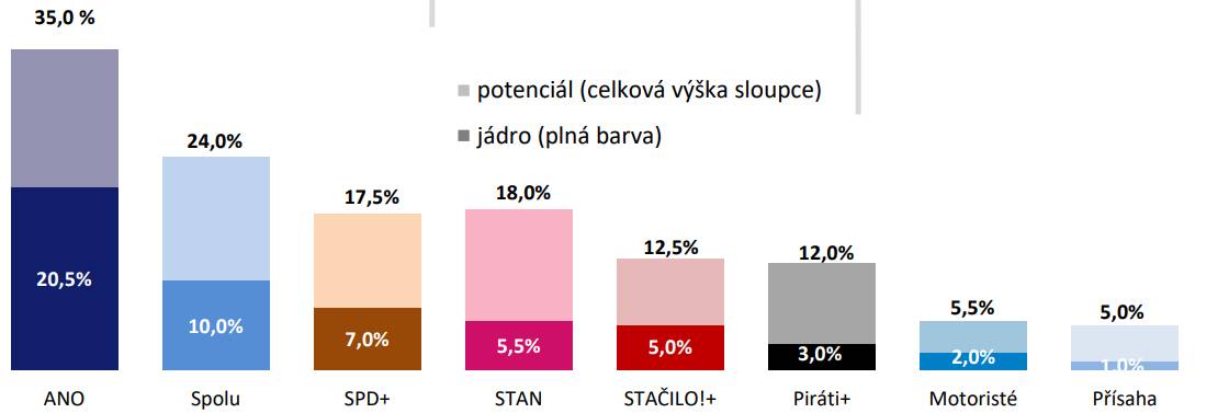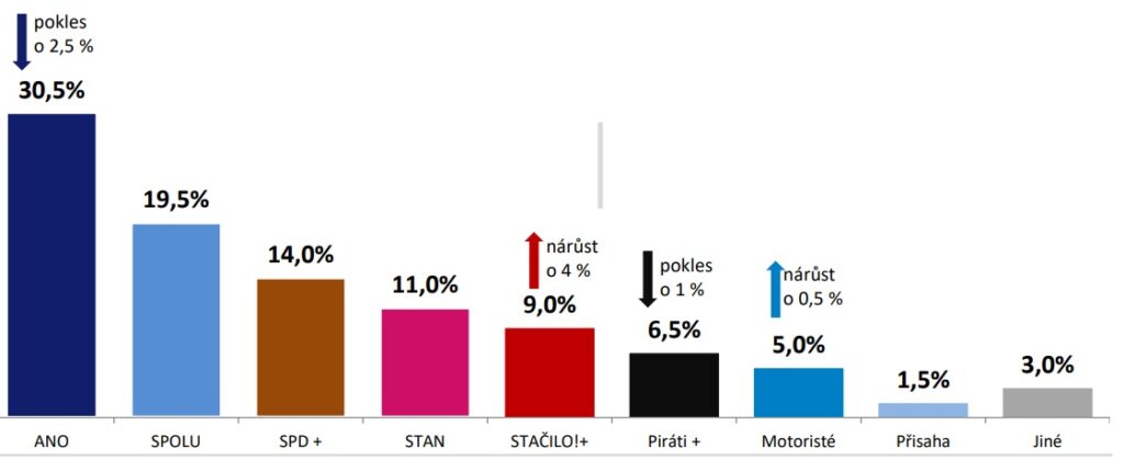 Výrazně posílilo hnutí STAČILO!, které by v srpnu získalo devět procent hlasů, tedy o čtyři procentní body více než před měsícem. Průzkum poprvé zachytil i červencovou dohodu STAČILO! se Sociálními demokraty. O půl procentního bodu si polepšili také Motoristé, kteří by se se ziskem pěti procent dostali na hranici vstupu do Sněmovny. Piráti naopak klesli na 6,5 procenta.