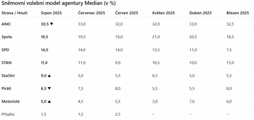 Hnutí ANO by v srpnu podle volebního modelu agentury Median vyhrálo sněmovní volby se ziskem 30,5 procenta hlasů. Oproti červenci si však polepšit nedokázalo – naopak o 2,5 procentního bodu oslabilo. Druhá koalice SPOLU zůstala na 19,5 procenta, třetí SPD s podporou menších uskupení by brala 14 procent a hnutí STAN si udrželo 11 procent.