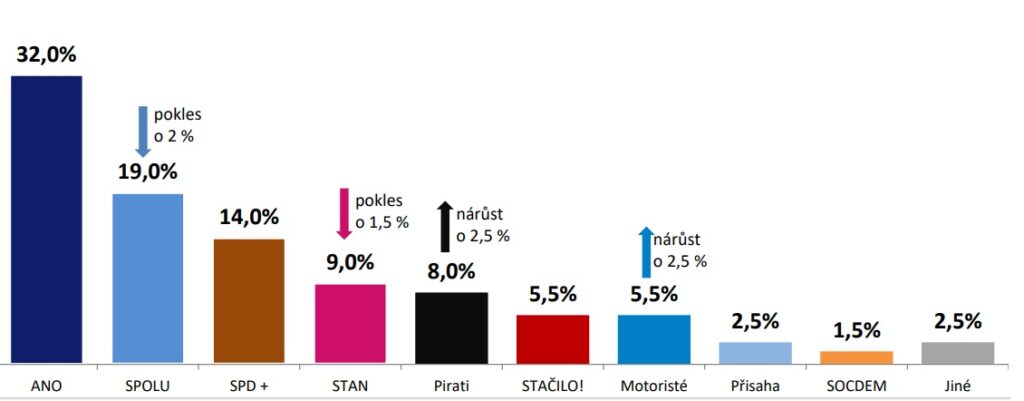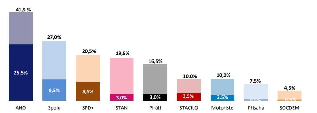 Růst potenciálu hlásí opoziční strany – ANO na 41,5 % a SPD s podporou menších stran na 20,5 %. Motoristé sobě a hnutí STAČILO! mohou z tohoto ohledu doufat až v 10 procent hlasů.
