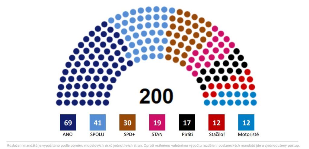 ANO by si v hypotetických volbách za měsíc červen připsalo 69 poslaneckých mandátů, SPOLU 41, SPD s podporou dalších stran 30, Starostové 19, Piráti 17 a STAČILO! s Motoristy po dvanácti. Případná koalice ANO + SPOLU, kterou však expremiér Andrej Babiš vylučuje, by měla většinu 110 poslanců a poslankyň. Jiné většinové koalice by musely být složeny ze tří a více stran. Současná vládní koalice (SPOLU, STAN) by si připsala pouze 60 poslaneckých mandátů.