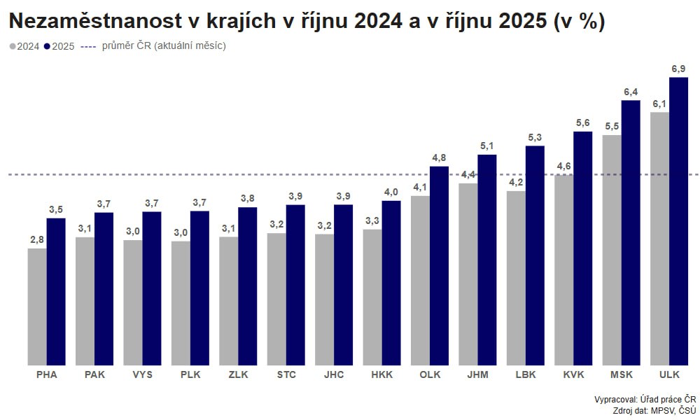 Úřad práce ČR (ÚP ČR) evidoval na konci října na svých krajských pobočkách a jejich kontaktních pracovištích 340 509 uchazečů o zaměstnání, což bylo meziročně o 51 506 osob více. Podíl nezaměstnaných vzrostl ze zářijových 4,5 procenta na 4,6 %. Loni ve stejném měsíci ale činil jen 3,8 %. Převis poptávky nad nabídkou zaměstnání přitom stále roste.