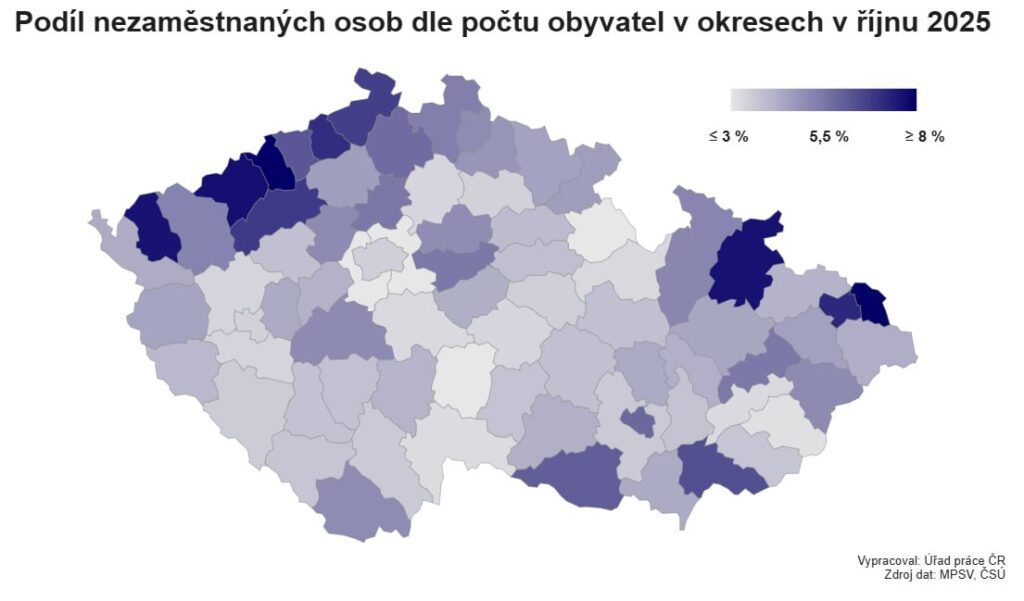 Na jedno volné pracovní místo aktuálně připadá v ČR v průměru zhruba 3,6 uchazeče o zaměstnání, z toho nejvíce v okresech Karviná (22,4), Sokolov (17,1), Děčín (14,1) a Hodonín (12).