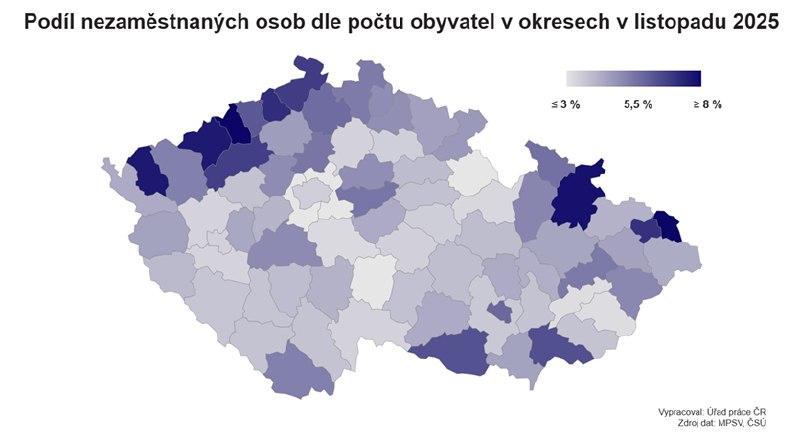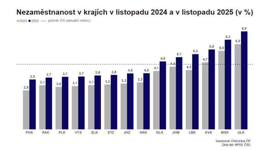 Úřad práce ČR (ÚP ČR) evidoval na konci listopadu na svých krajských pobočkách a jejich kontaktních pracovištích 341 311 uchazečů o zaměstnání, což bylo meziročně o 50 886 osob více. Podíl nezaměstnaných zůstal na říjnových 4,6 procenta. Loni ve stejném měsíci ale činil jen 3,9 %. Převis poptávky nad nabídkou zaměstnání přitom dál roste.