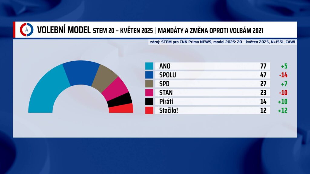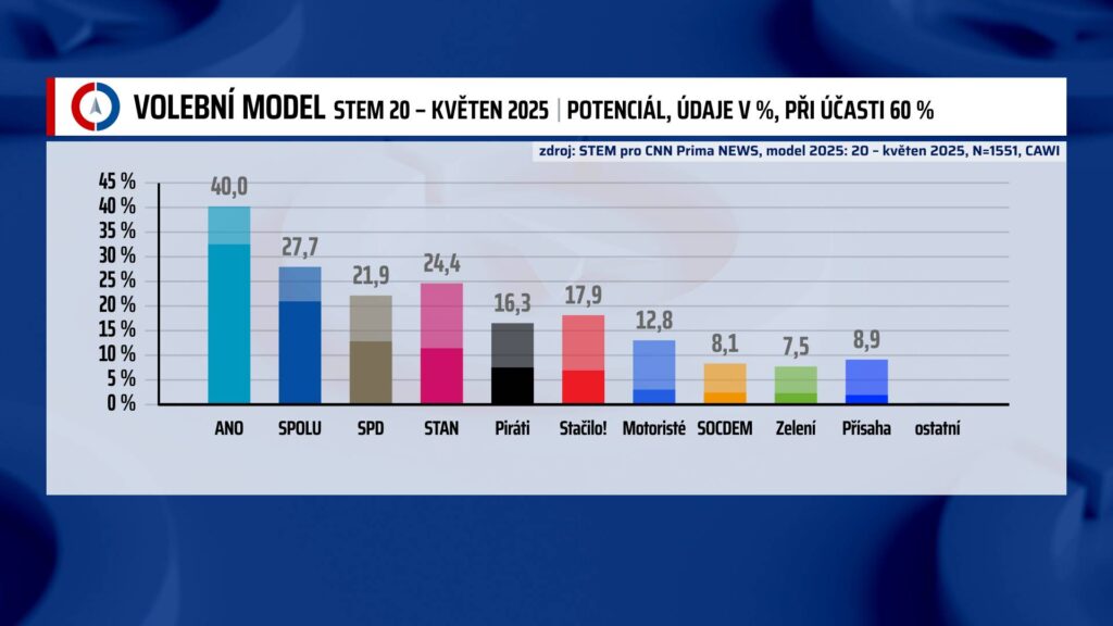 Volby do Poslanecké sněmovny by v květnu vyhrálo hnutí ANO, jež by obdrželo přes 32 procent hlasů. Vyplývá to z pravidelného týdenního průzkumu, který vypracovala společnost STEM pro CNN Prima NEWS. Na druhém méstě je koalice SPOLU, třetí zůstává SPD s podporou tří národně-konzervativních stran, naopak obrovský propad zaznamenali Motoristé sobě, kteří místo atakování pětiprocentní hranice spadli pod tři procenta!