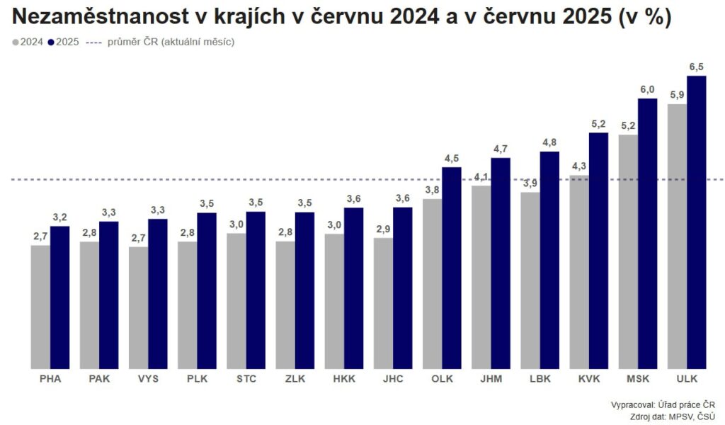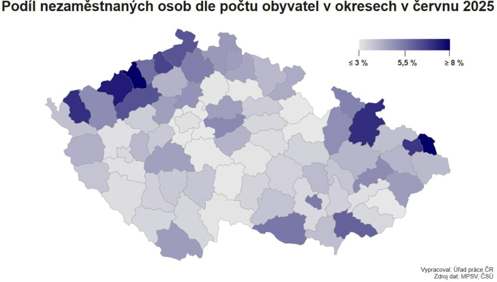 Na jedno volné pracovní místo aktuálně připadá v ČR v průměru zhruba 3,2 uchazeče o zaměstnání, z toho nejvíce v okresech Karviná (21,8), Sokolov (13,7), Děčín (12,9), Hodonín (10,7), Bruntál a Louny (shodně 8,8).