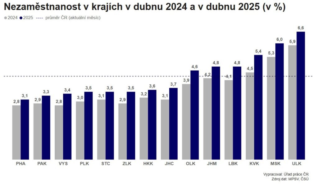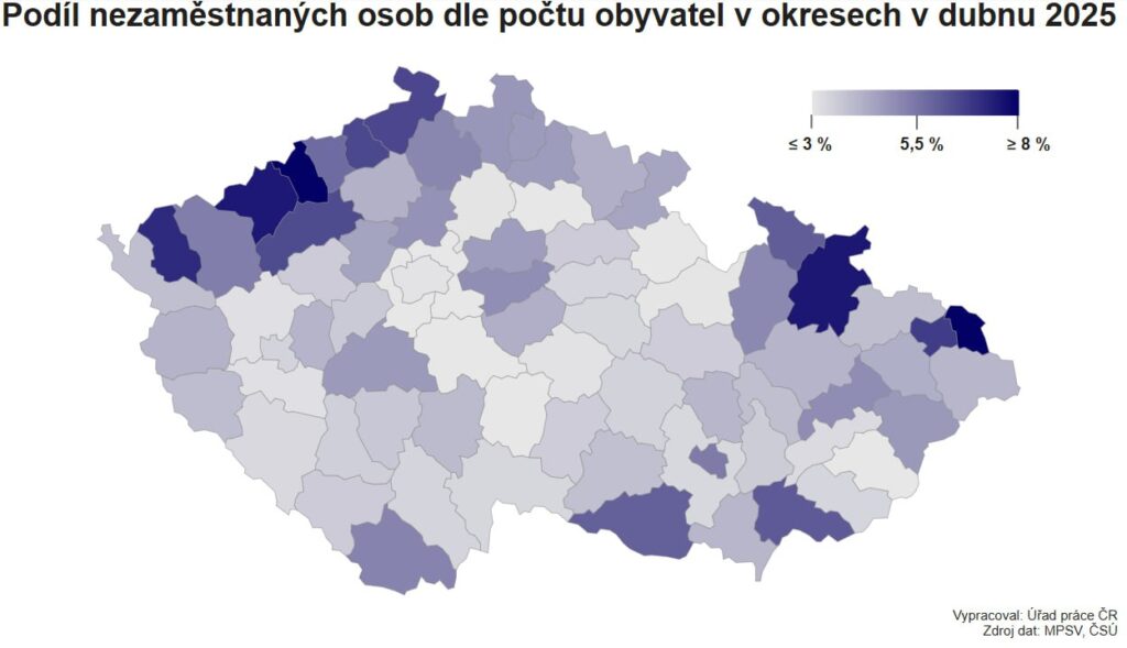 Zaměstnavatelé nabízeli ke konci dubna prostřednictvím ÚP ČR celkem 95 798 volných pracovních míst, což je o 4046 více než v březnu. Na jedno volné pracovní místo aktuálně připadá v ČR v průměru zhruba 3,3 uchazeče o zaměstnání, z toho nejvíce v okresech Karviná (23,7), Sokolov (17,2), Děčín (12,8), Hodonín (12,1) a Bruntál (10,5).