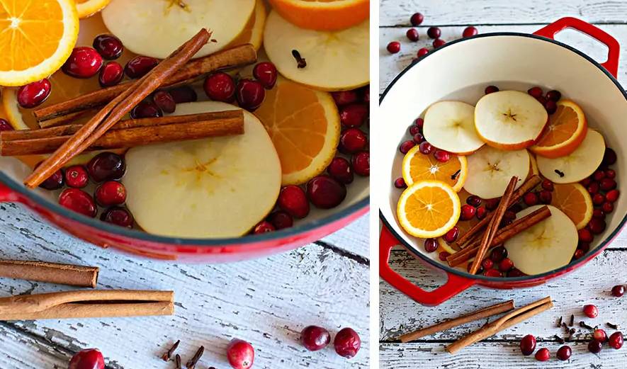 Budete potřebovat: jablečnou a pomerančovou kůru, několik skořicových tyčinek a hřebíček. Volitelně můžete použít další čerstvé nebo mražené brusinky a vanilkový extrakt.