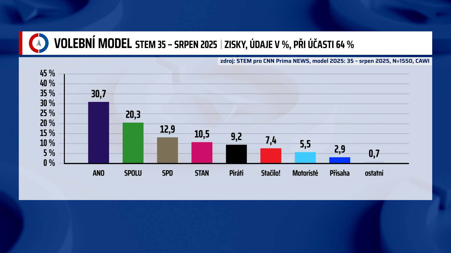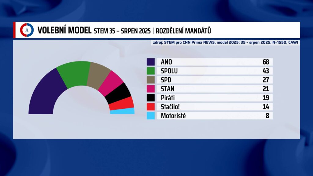 Podle nejnovějšího volebního modelu agentury STEM pro CNN Prima NEWS by se vítězem říjnových sněmovních voleb stalo hnutí ANO. Získalo by 30,7 procenta hlasů, což je oproti předchozímu průzkumu mírný pokles o půl procentního bodu. Naopak posilují hnutí STAČILO! i strana Motoristé sobě.