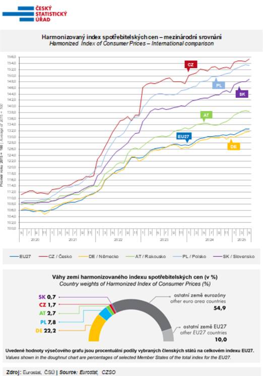 Česko v růstu spotřebitelských cen, jak ukazuje graf, dlouhodobě výrazně převyšuje průměr Evropské unie a trvale drží neslavný primát i mezi svými nejbližšími sousedy.