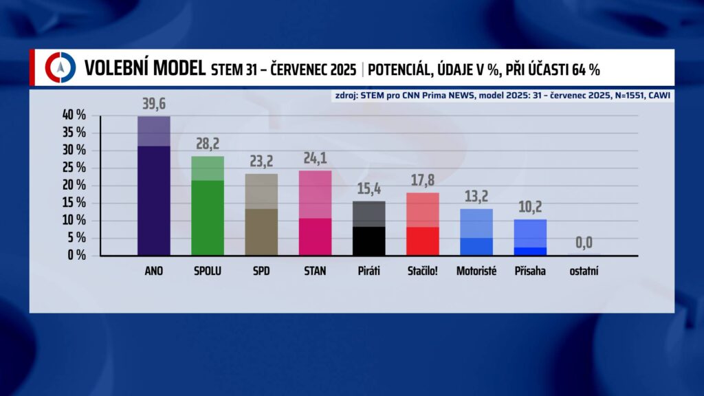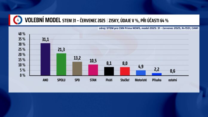 Podle nejnovějšího modelu agentury STEM pro CNN Prima NEWS by volby do Poslanecké sněmovny s přehledem vyhrálo hnutí ANO, které by získalo 31,1 procenta hlasů. Strana vedená Andrejem Babišem si tak udržuje výrazný náskok před konkurencí, i když oproti předchozím průzkumům mírně oslabila. Do Sněmovny by aktuálně prošlo šest kandidujících subjektů, včetně hnutí STAČILO!, naopak na Motoristy sobě by se nedostalo.