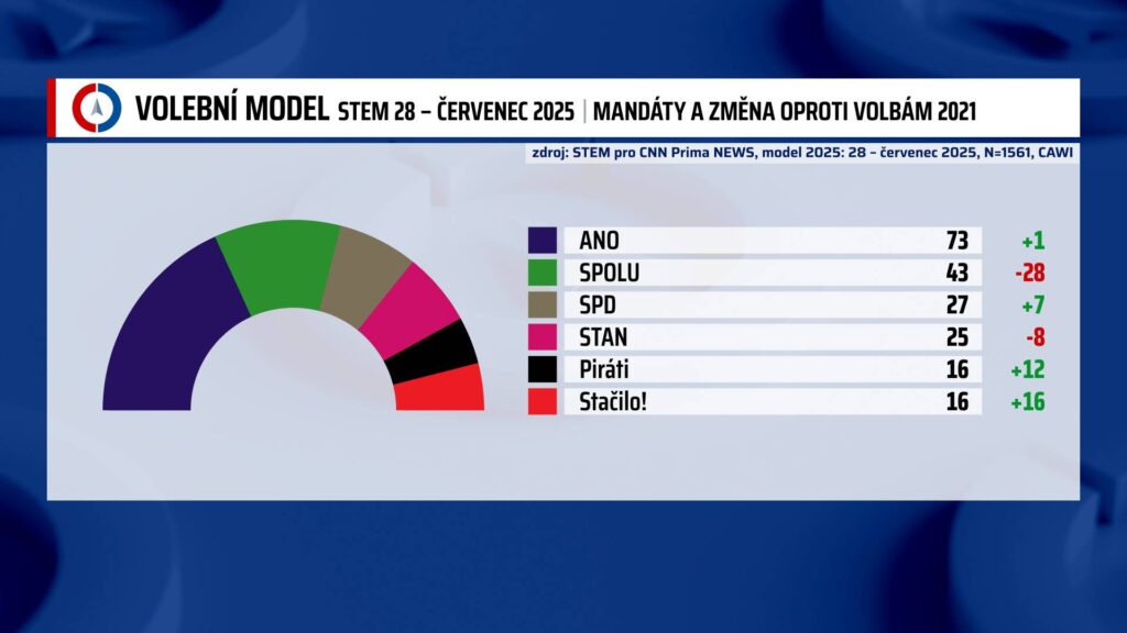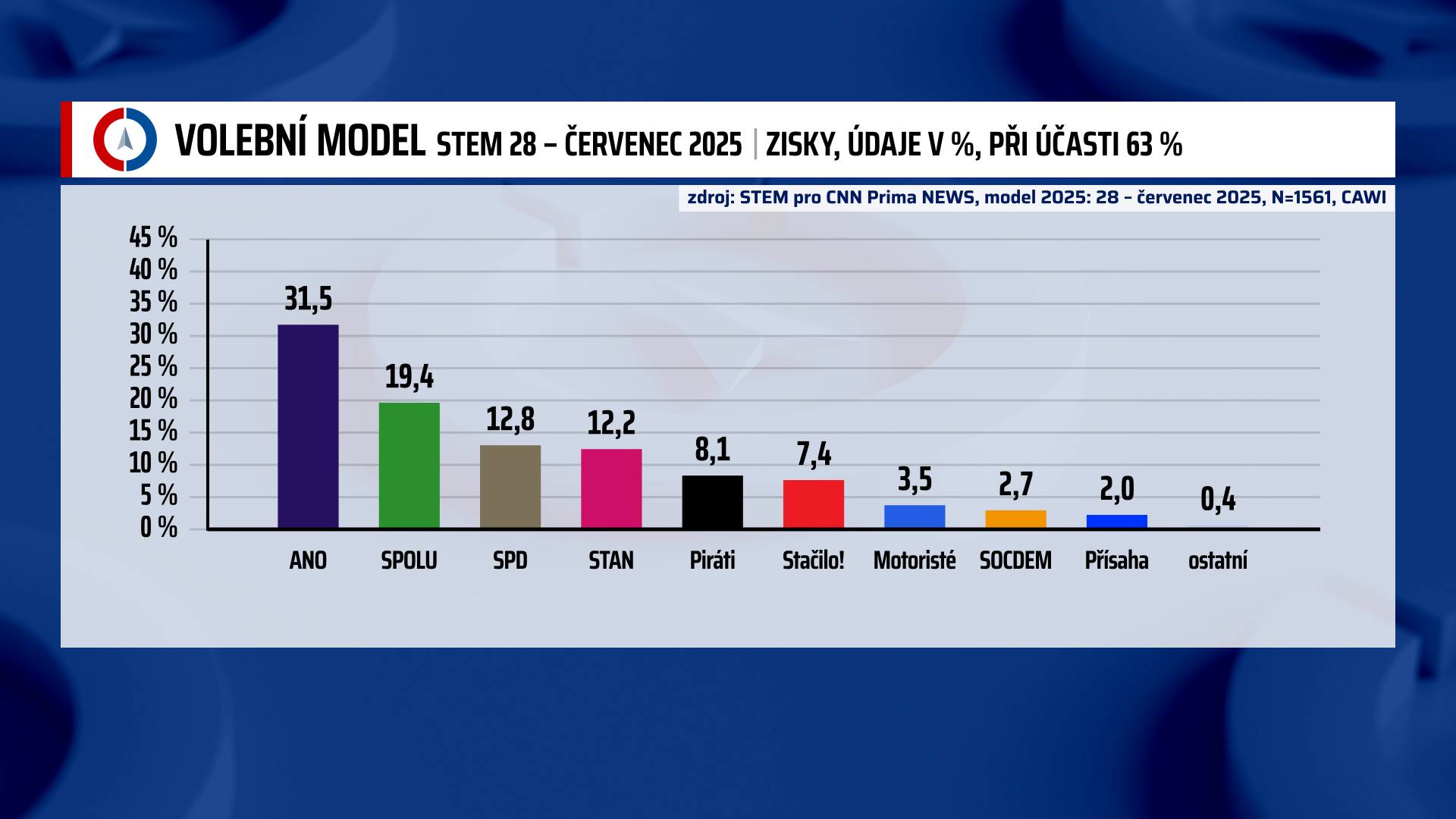 Volby do Poslanecké sněmovny by vyhrálo ANO, obdrželo by přes 31 procent hlasů. Vyplývá to z nového výzkumu společnosti STEM pro CNN Prima NEWS, který zároveň přisoudil nejlepší výsledek od počátku roku hnutí STAČILO! tvořenému KSČM, Českou stranou národně sociální (ČSNS), Spojenými demokraty – sdružením nezávislých (SD-SN) a nově i Sociálními demokraty (SOCDEM).