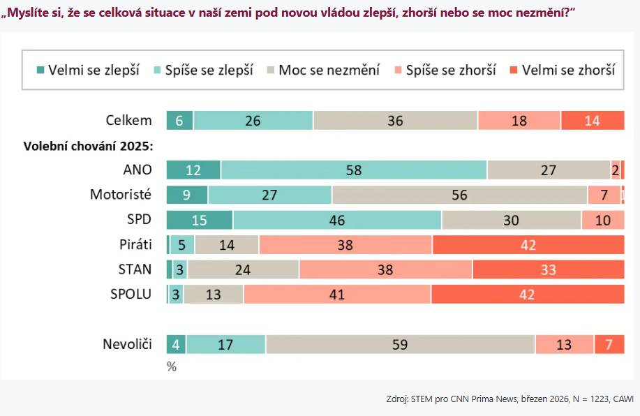 Očekávání dalšího vývoje se mezi voliči výrazně liší podle jejich politických preferencí. Zatímco příznivci hnutí ANO jsou převážně optimističtí – zlepšení poměrů očekává zhruba 70 procent z nich – podobně to vidí i většina voličů SPD, kde s pozitivním vývojem počítá 61 procent. U Motoristů převažuje spíš zdrženlivost: 56 procent jejich voličů nepředpokládá, že by se situace v zemi nějak zásadně změnila.