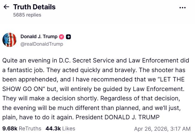 »To byla ale noc ve Washingtonu,« napsal Trump prostřednictvím Truth Social. »Pachatel byl postaven před soud a já navrhl ‚ať show pokračuje‘, ale poslouchám doporučení orgánů činných v trestním řízení,« připojil.