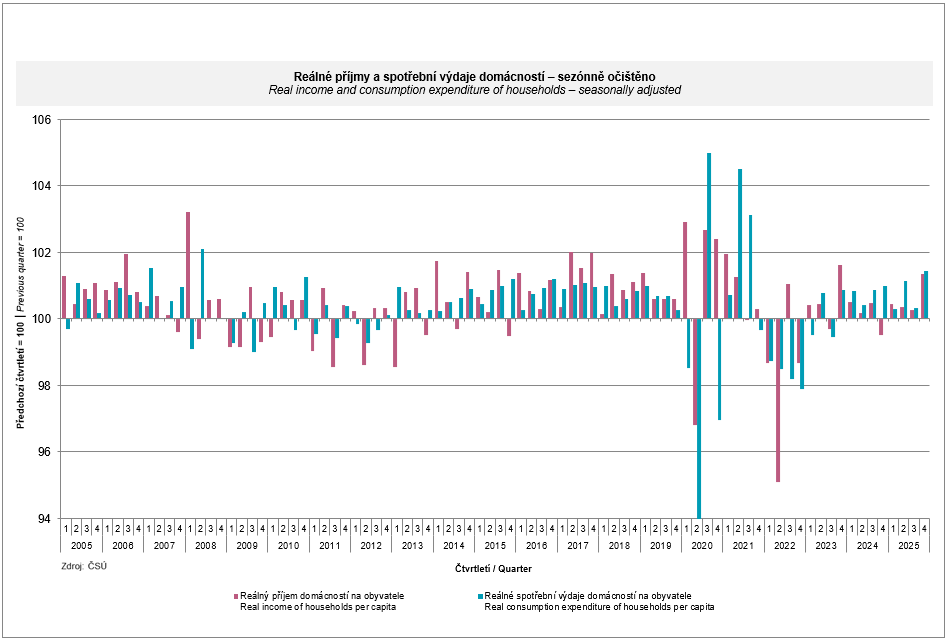 Reálné příjmy domácností na obyvatele podle nich loni vzrostly proti roku 2024 o 1,1 % a reálná spotřeba domácností na obyvatele se zvýšila o tři procenta. Průměrný měsíční příjem ze zaměstnání stoupl meziročně o 4,1 % na 52 620 korun.